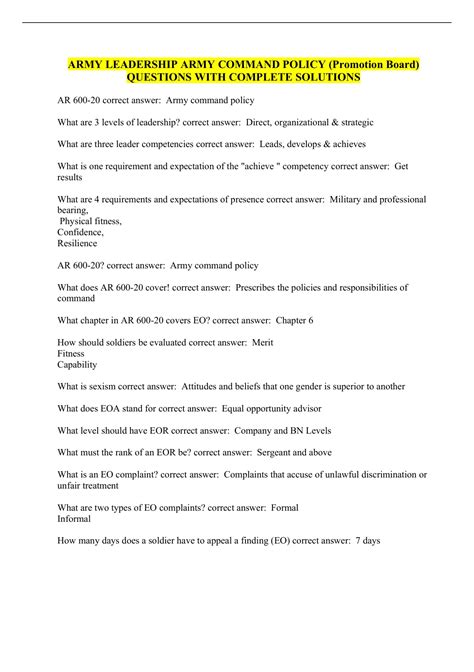 Direct organizational strategic what are the 3 levels of leadership? Encourages victims to report without fear 3. Web study with quizlet and memorize flashcards containing terms like when was the position of sergeant major of the army established?, who is the only member of both your chain of command the your nco support channel?, how does the chain of command support the nco support channel? Corrective training should be directly related to the area of deficiency Web army promotion board questions need to be relevant and up to date. Web what adrp covers mission command? Ensure sensitivity and treatment for victims 5. Military discipline, and conduct, the army equal opportunity program, and the army sexual assault victim program. Cram.com makes it easy to get the grade you want! Q.what ar covers army command policy?