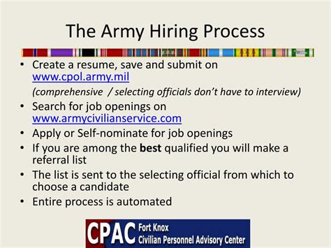 It is the policy of the department of army (da) and the department of defense (dod) to provide equal employment opportunity for all of its employees and applicants for employment in every aspect of their employment and working conditions. Web civilian hiring), 1 feb 21. Web the enlistment process begins your career as an enlisted soldier in the active army or army reserve. Web process as smooth and quick as possible step 1: Hiring officials will ensure that recruitment practices comply with the cba, merit promotion plan, equal employment opportunity ( eeo) affirmative action goals, and any Web 70 questions about hiring process at u.s. They can help you define your goals, plan for key steps in the process, and guide you in the right direction. Web united states army training and doctrine command Web the cssc will support processing for applicants by requesting ircs for the following: Filling out the application is not a commitment to serve. The purpose of this policy is to ensure a selection and hiring process with high
