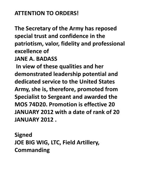 Attention To Orders Army Script. The president of the united states, acting upon the recommendation of the secretary of thearmy, has placed special trust and confidence in. The secretary of the army award for diversity and leadership in equal opportunity advisor goes to.